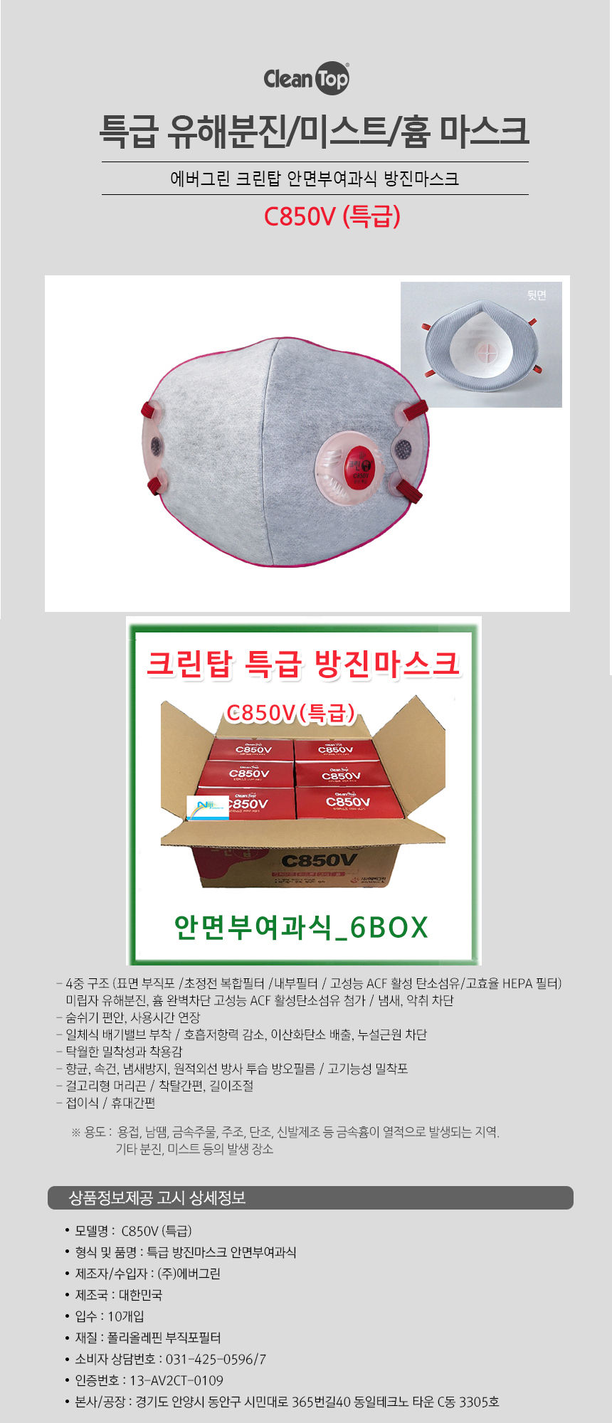 크린탑 2급 방진마스크c850v